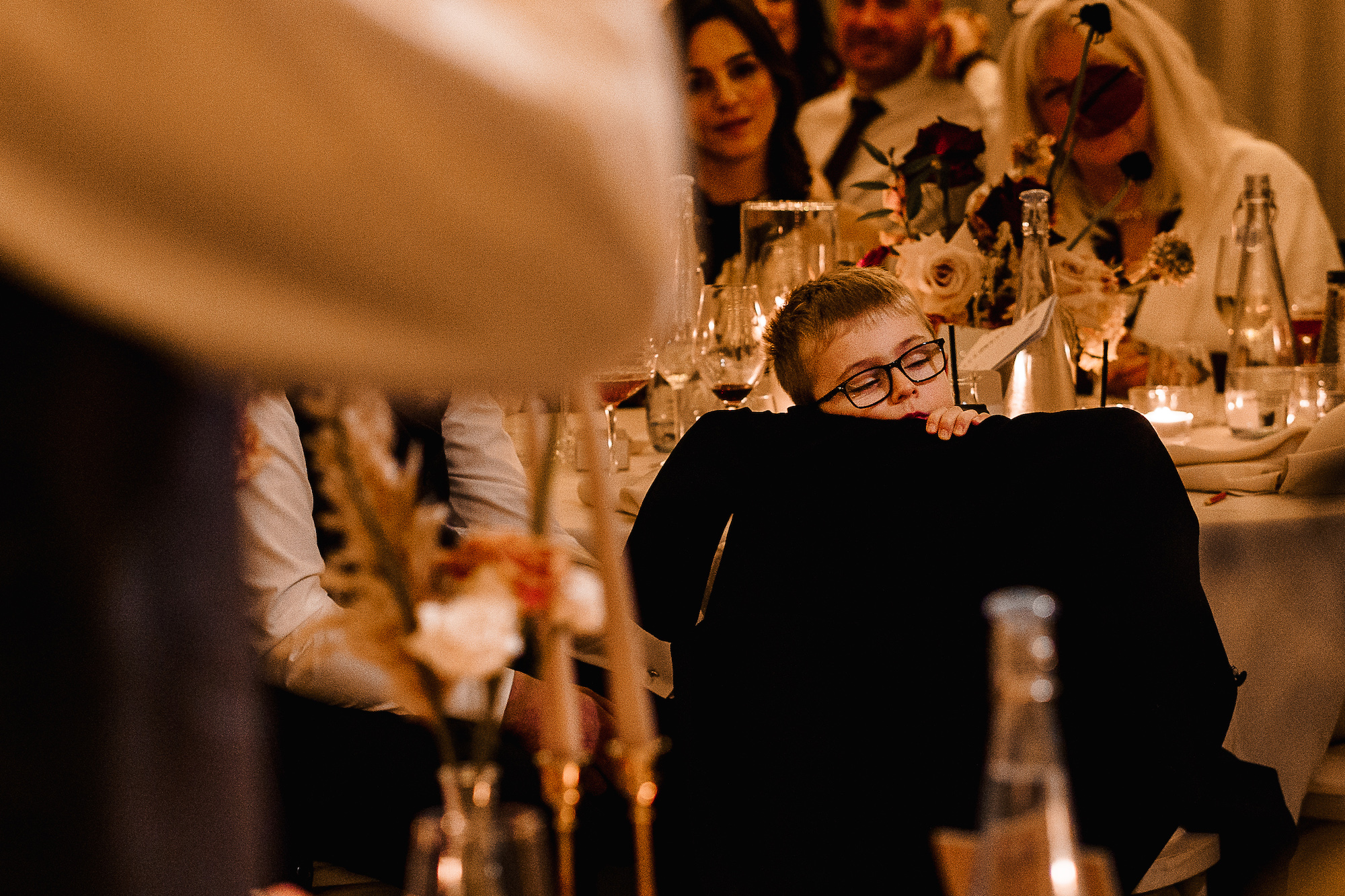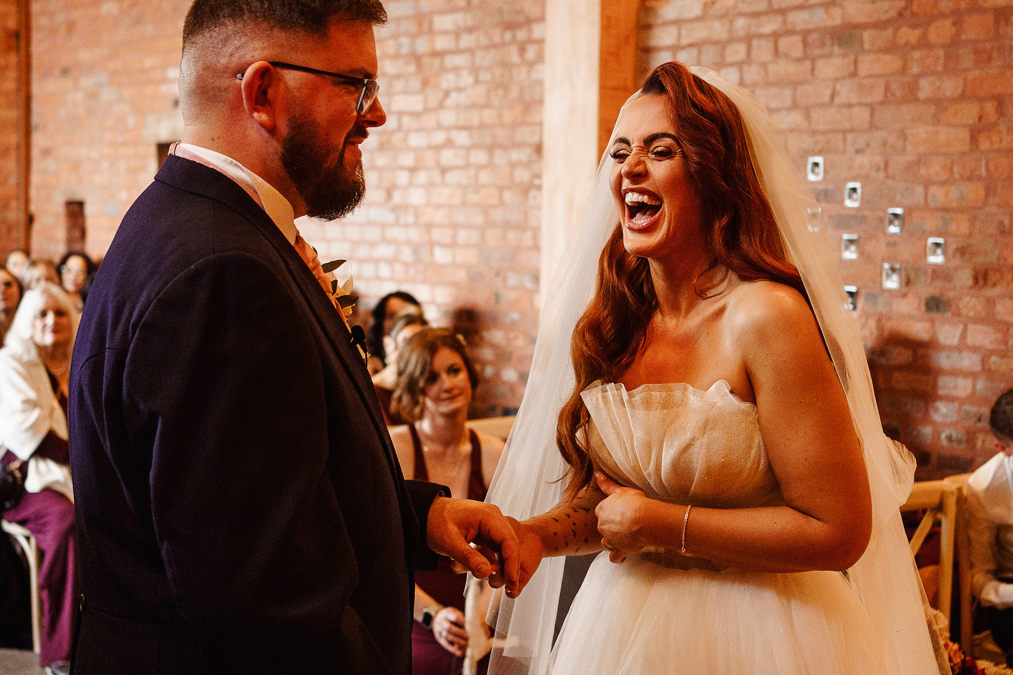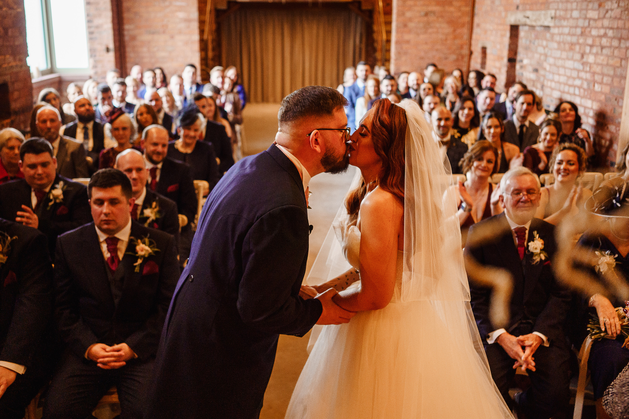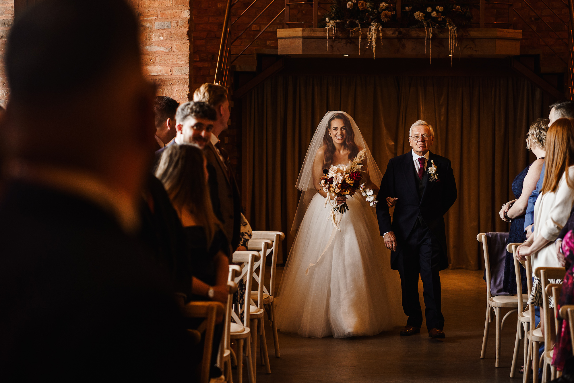 The ceremony room itself was dark and atmospheric—perfect for a December wedding. The warm, low lighting created an almost ethereal glow as Caroline made her way down the aisle. The room felt both elegant and intimate, with a sense of reverence that made the vows exchanged between the couple feel all the more profound. As a photographer, I’m always attuned to the lighting, and I had to work with the softer, ambient tones in the room to capture the emotion of the moment. It was a challenge, but one I relished, as the beauty of the space was simply breathtaking.