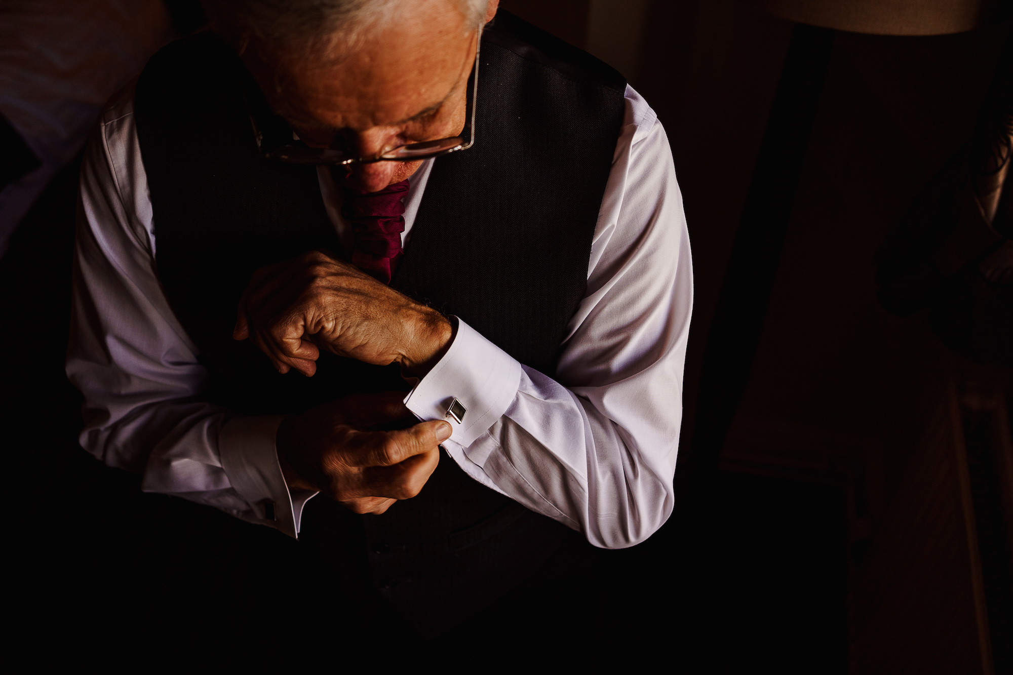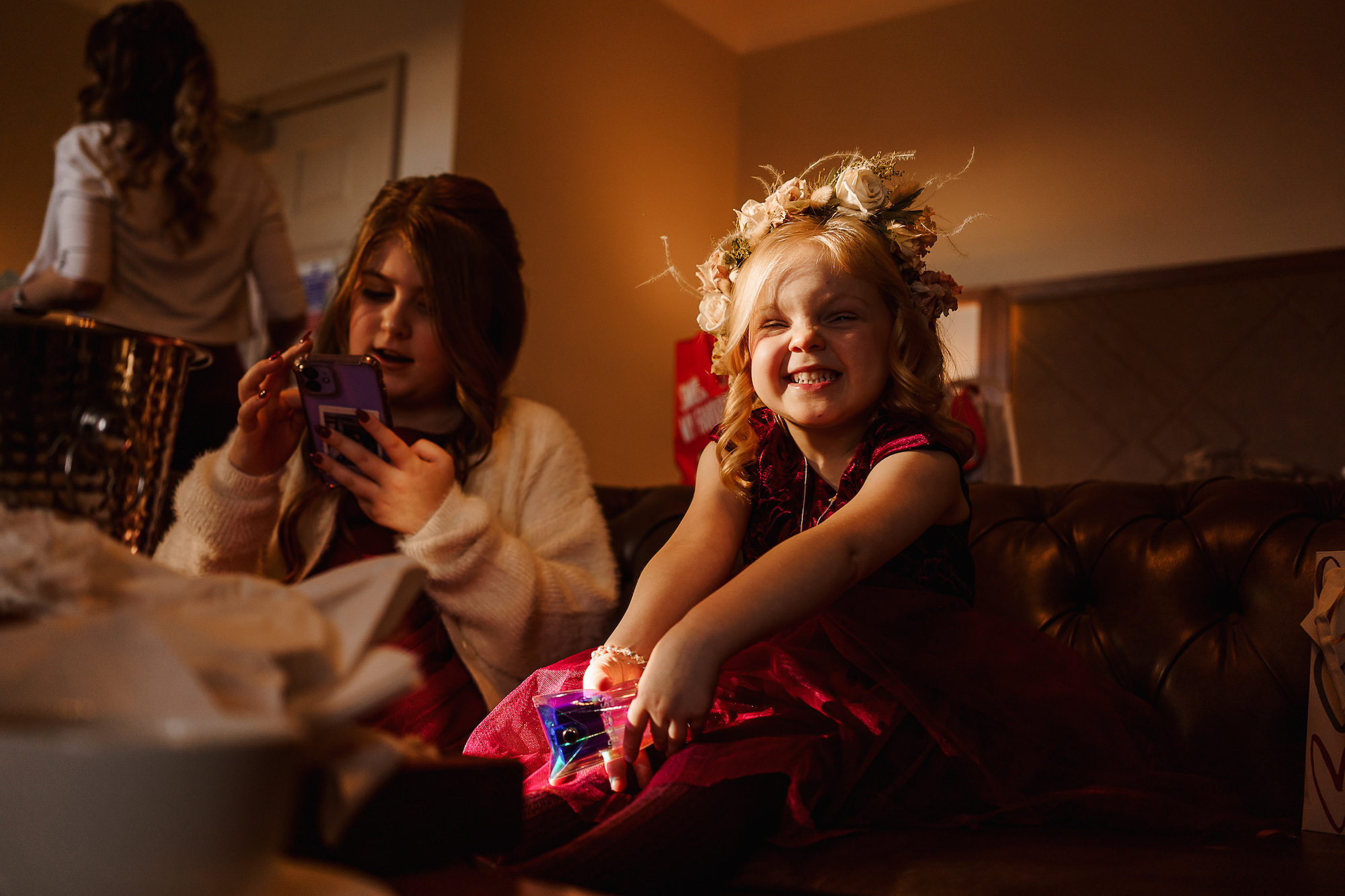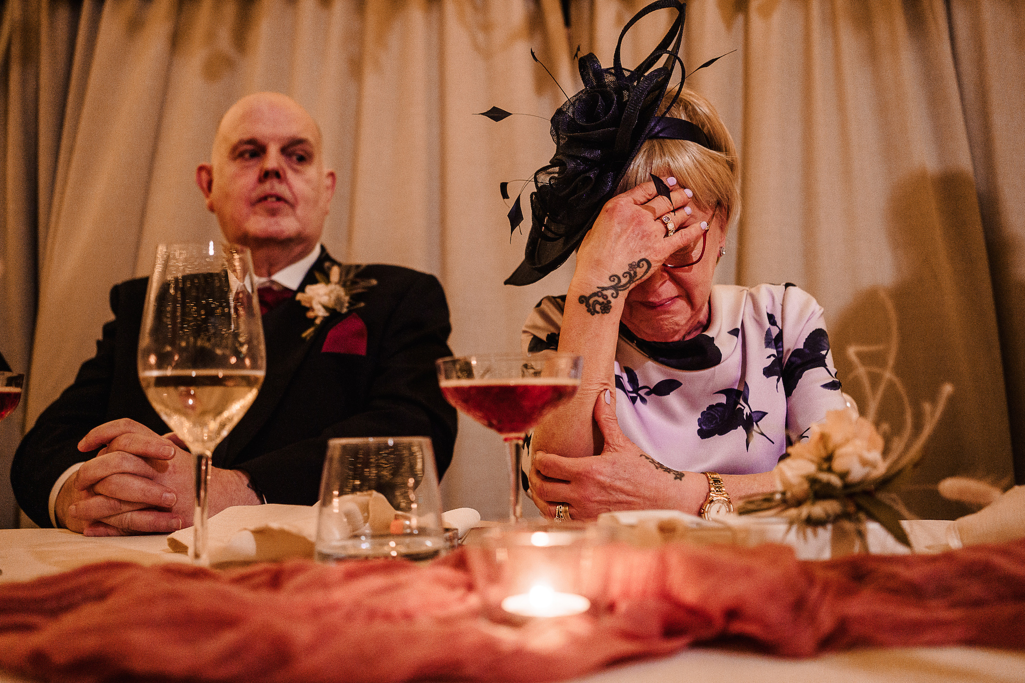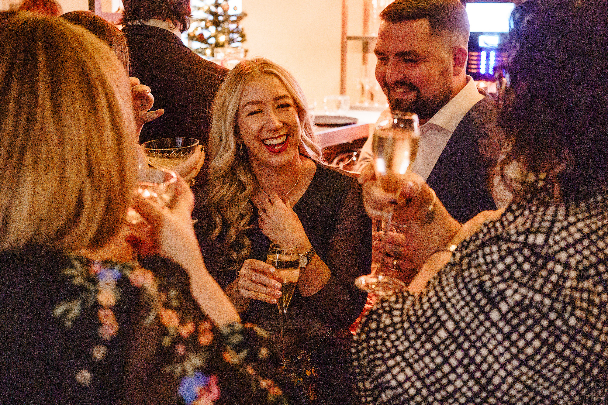 The ceremony room itself was dark and atmospheric—perfect for a December wedding. The warm, low lighting created an almost ethereal glow as Caroline made her way down the aisle. The room felt both elegant and intimate, with a sense of reverence that made the vows exchanged between the couple feel all the more profound. As a photographer, I’m always attuned to the lighting, and I had to work with the softer, ambient tones in the room to capture the emotion of the moment. It was a challenge, but one I relished, as the beauty of the space was simply breathtaking.